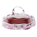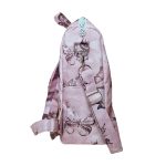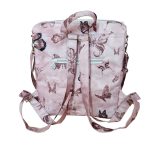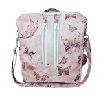Anyaga, színe: mályva színű, pillangó mintás vízálló gyöngyvászon-poliészter, gyöngyház rózsaszín textilbőr