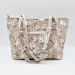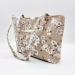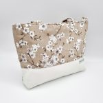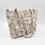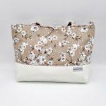 Anyaga, színe: barna alapon fehér virág mintás vászon, fehér színű textilbőr