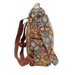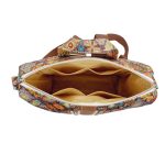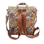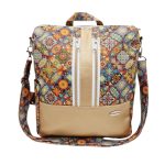 Anyaga, színe: barnás narancsos színű, mintás vízálló gyöngyvászon poliészter, bronz színű textilbőr