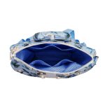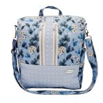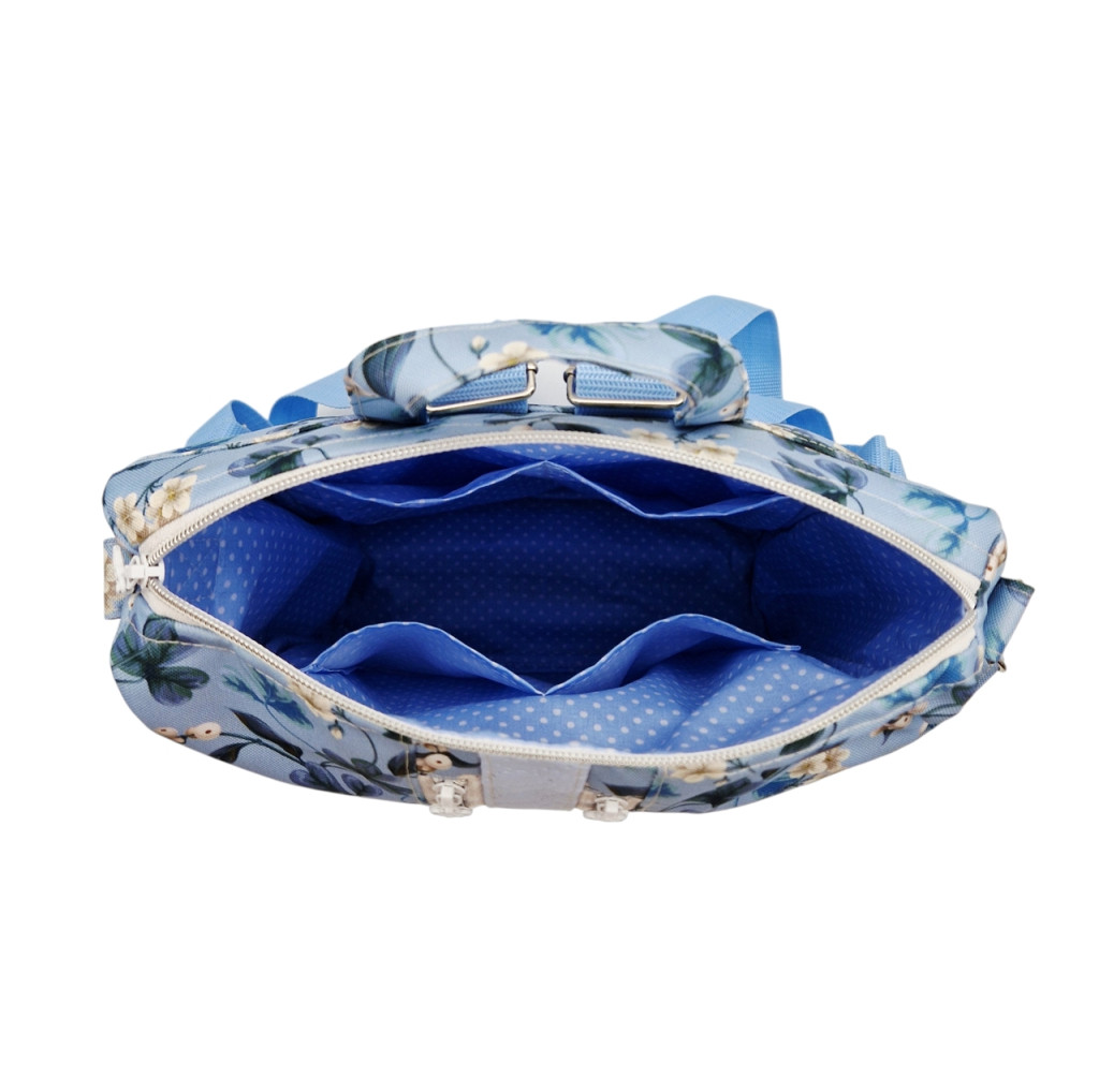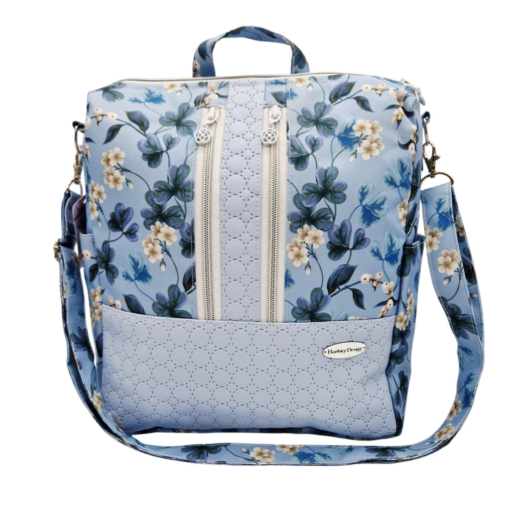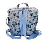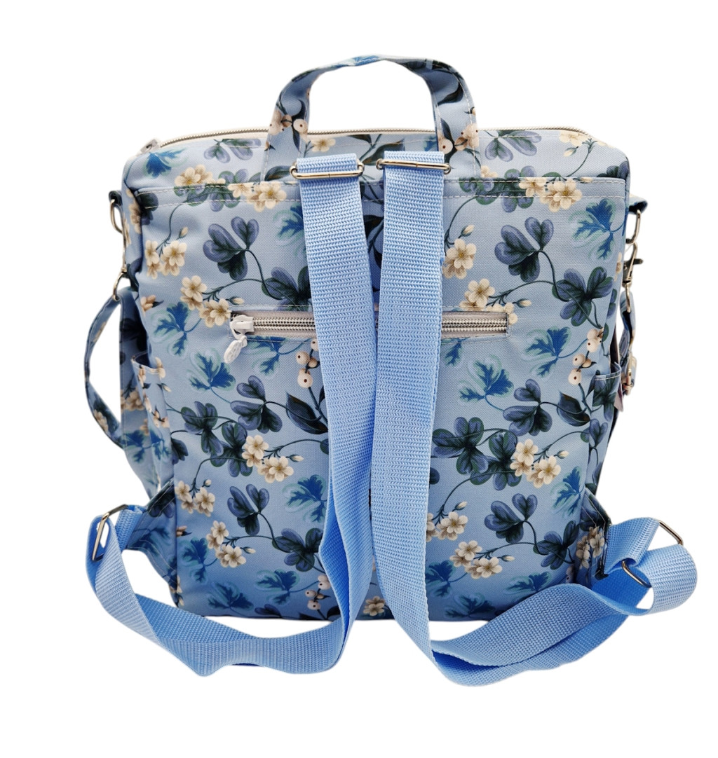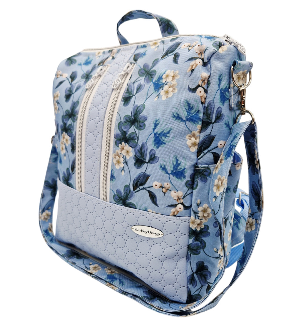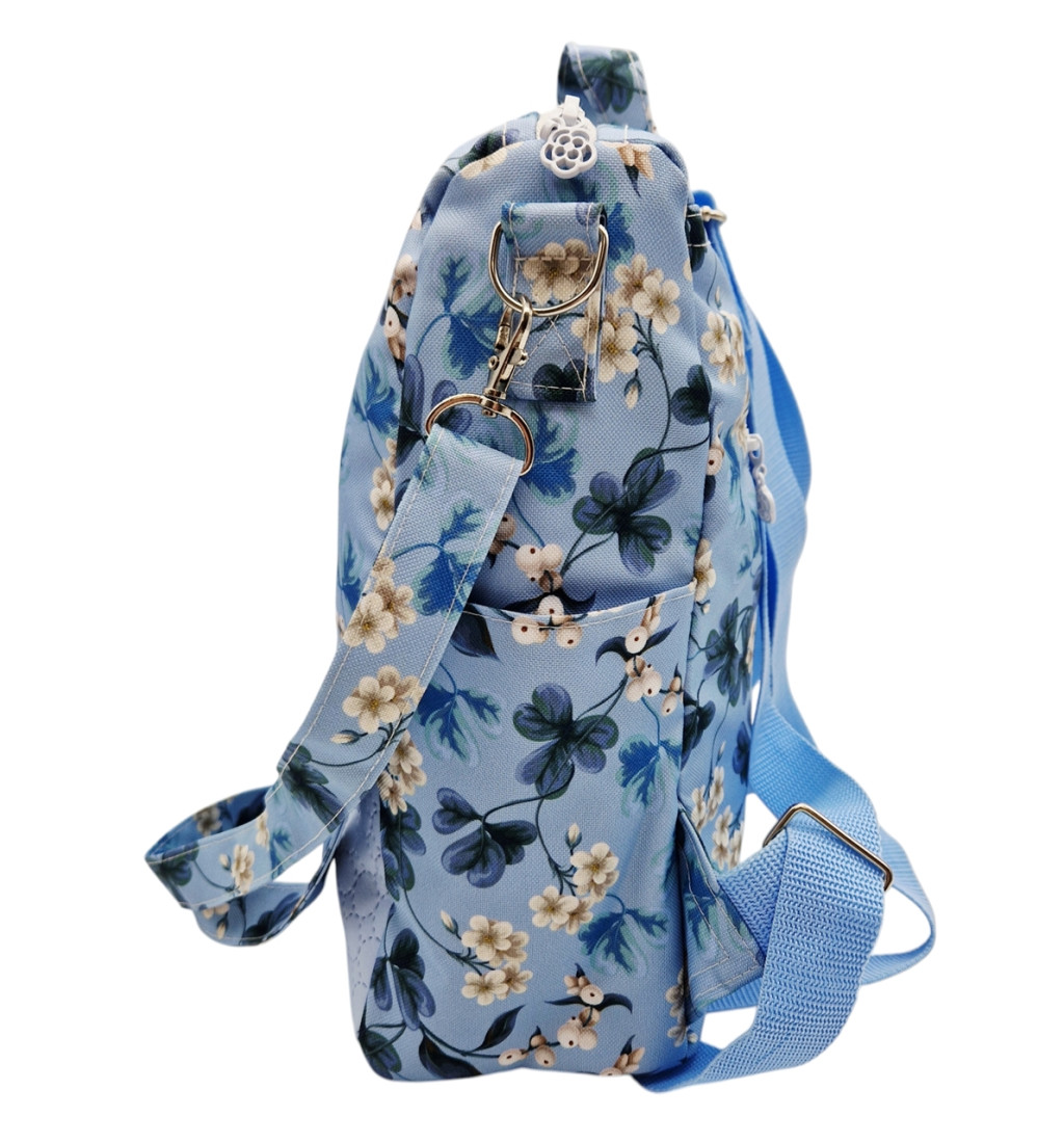 Anyaga, színe: kék alapon virág mintás vízálló gyöngyvászon-poliészter, világos kék színű textilbőr