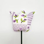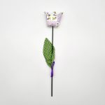 Anyag: fehér színű alapon, lila virág és pöttyös mintás pamutvászon, levele világos zöld alapon, fehér pöttyös mintás pamutvászonszára festett hurkapálca