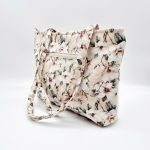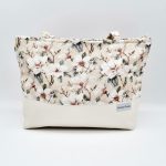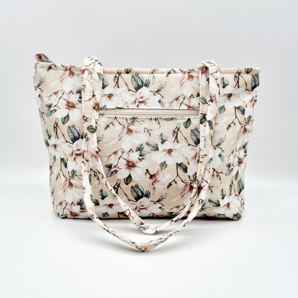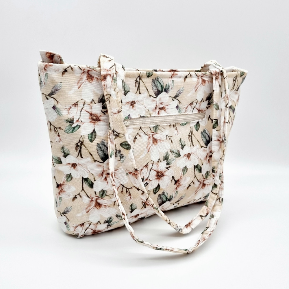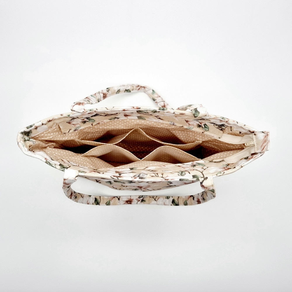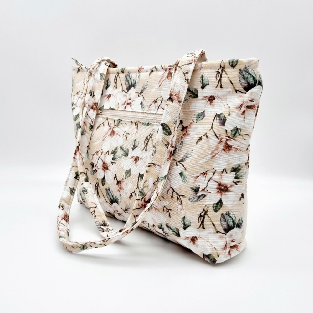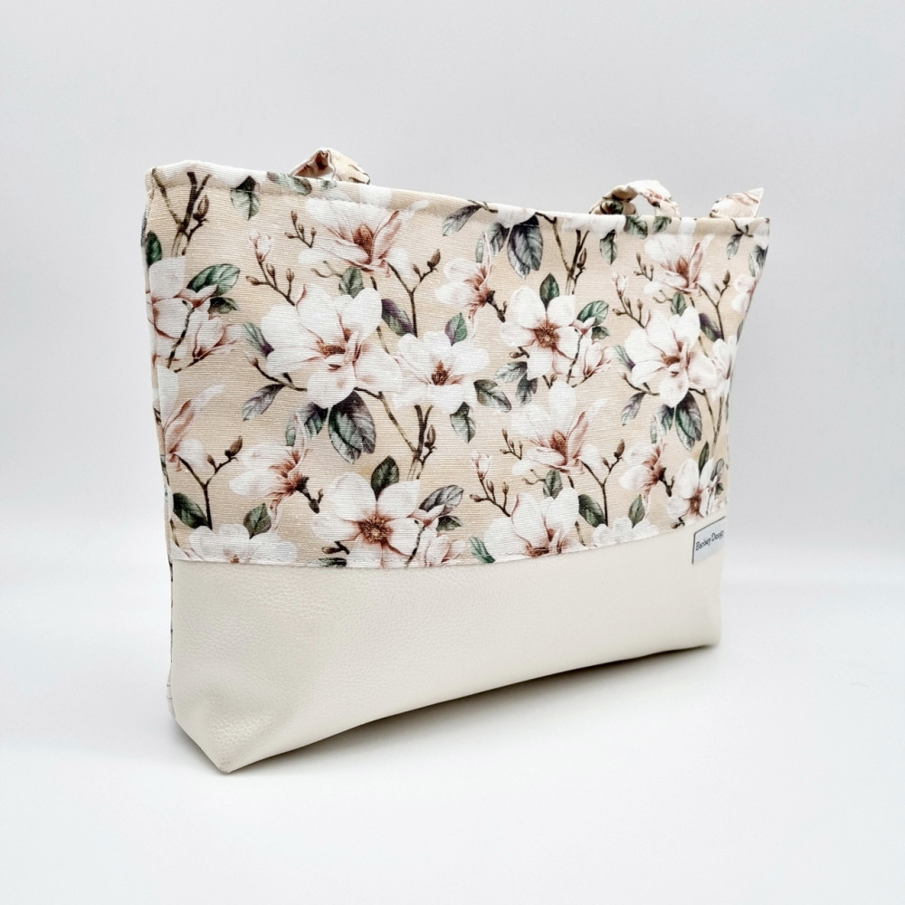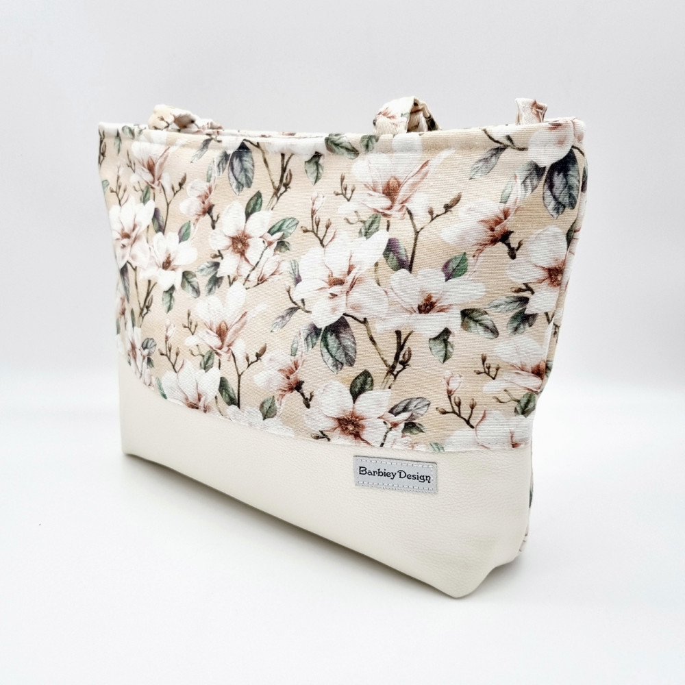 Anyaga, színe: halvány krém színű alapon, barackos fehér színű virág mintás vászon, gyöngyház bézs színű textilbőr